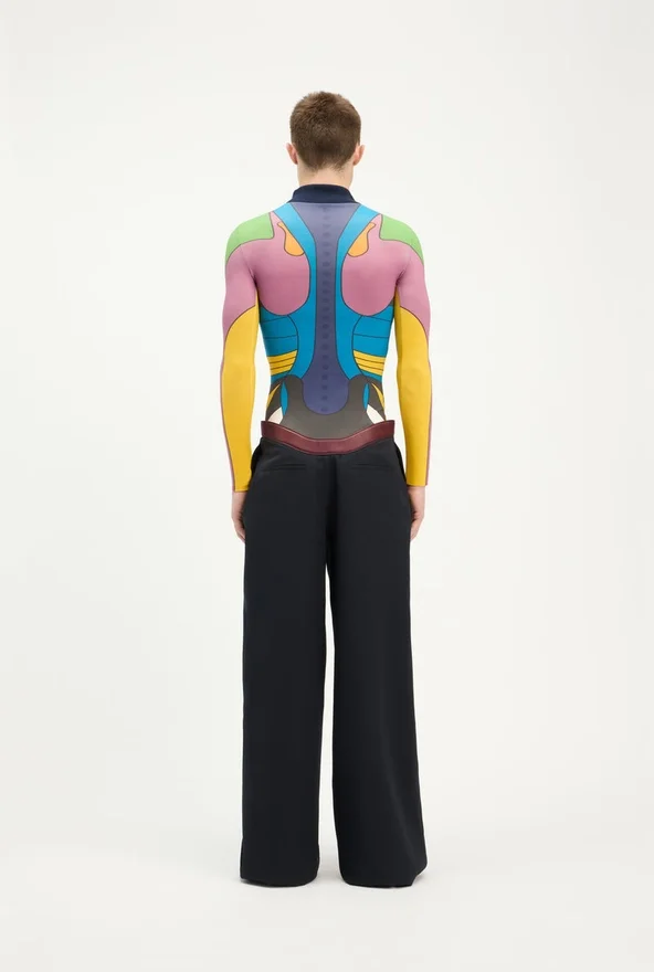 Curved Suit Pants in Navy Wool, Built-In Leather Belt with Metal “Junior” Logo Buckle.