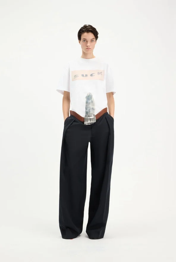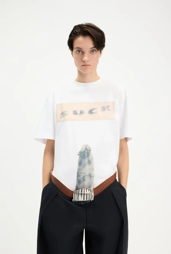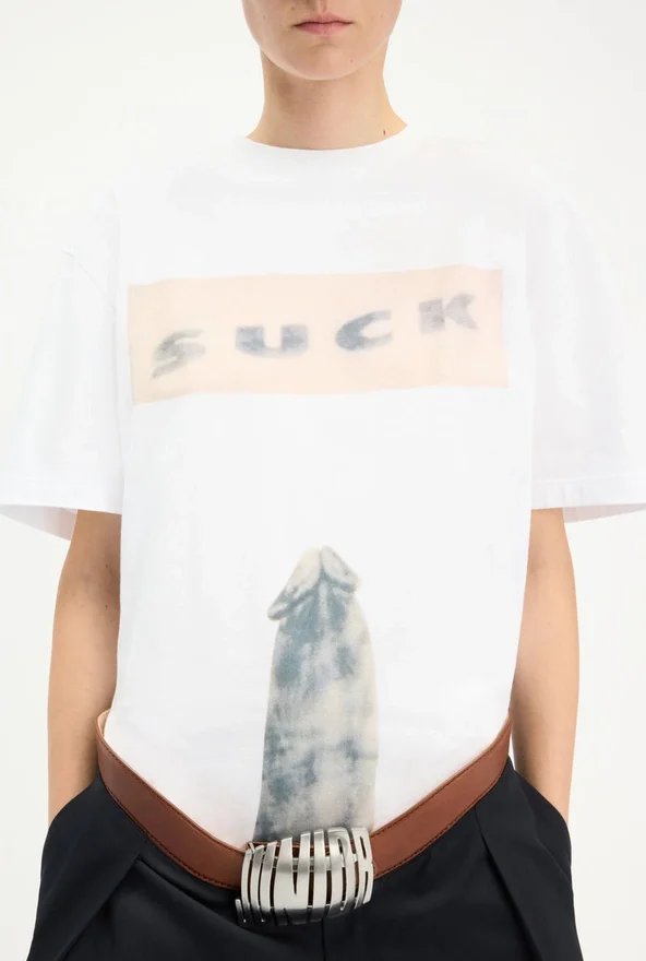 White Cotton T-Shirt with “Suck” Print.