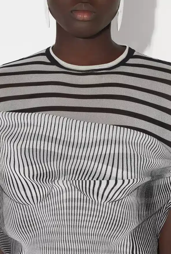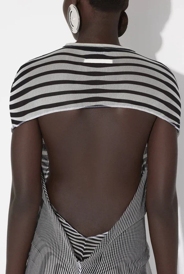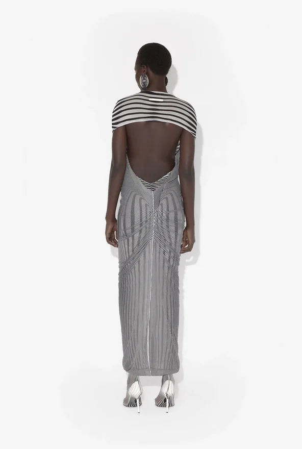 Long Open-Backed Ecru Tulle Dress, Black Stripes on Body and Draped Tulle on Front.