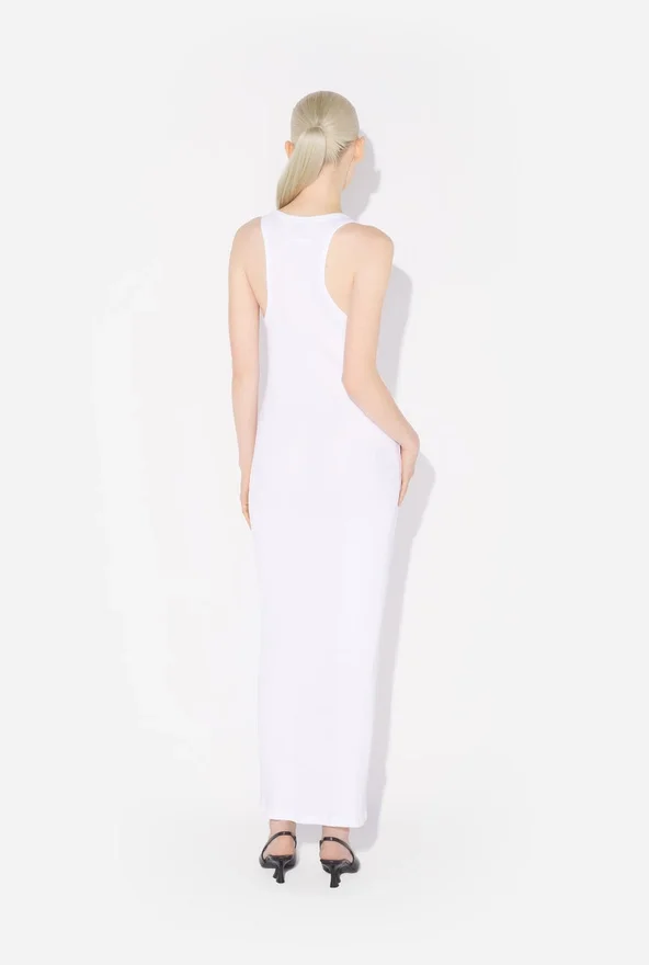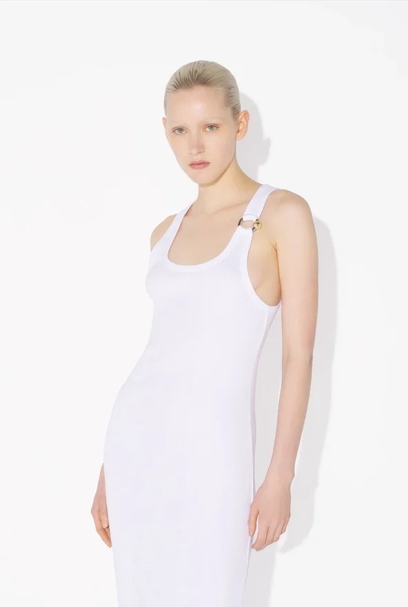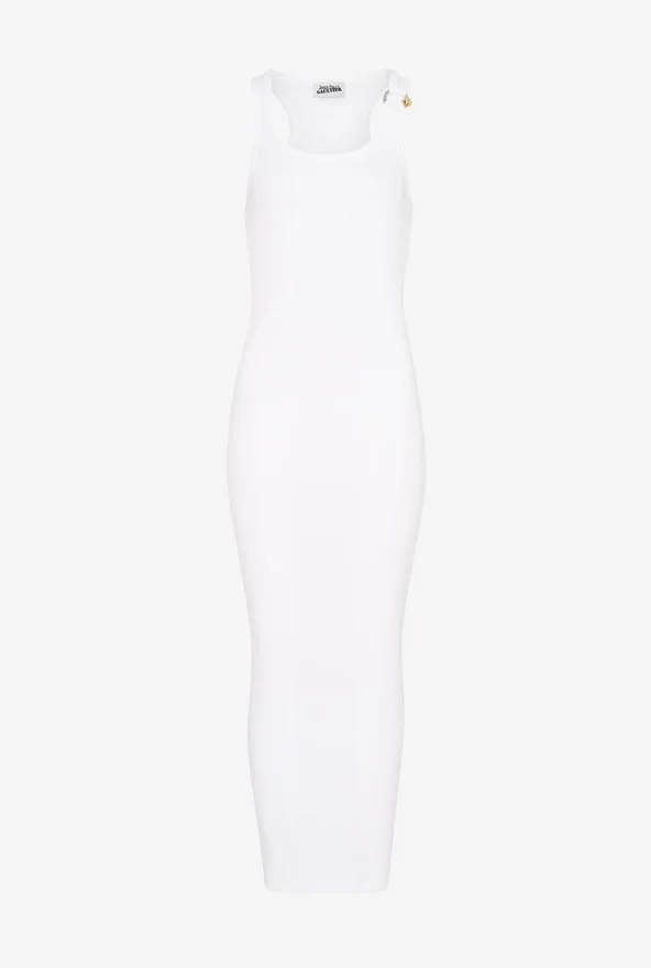 Long White Ribbed Cotton Dress with Engraved Jean Paul Gaultier Piercing Ring Detail.