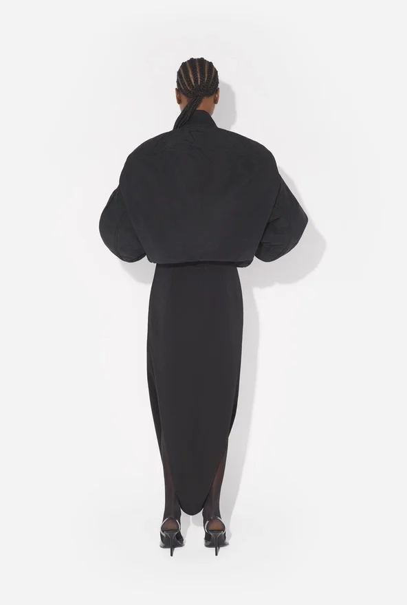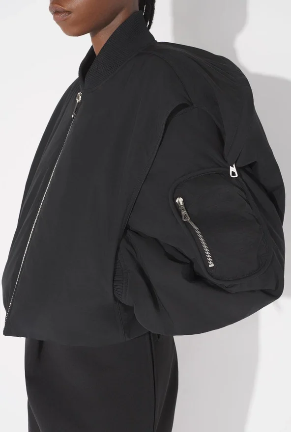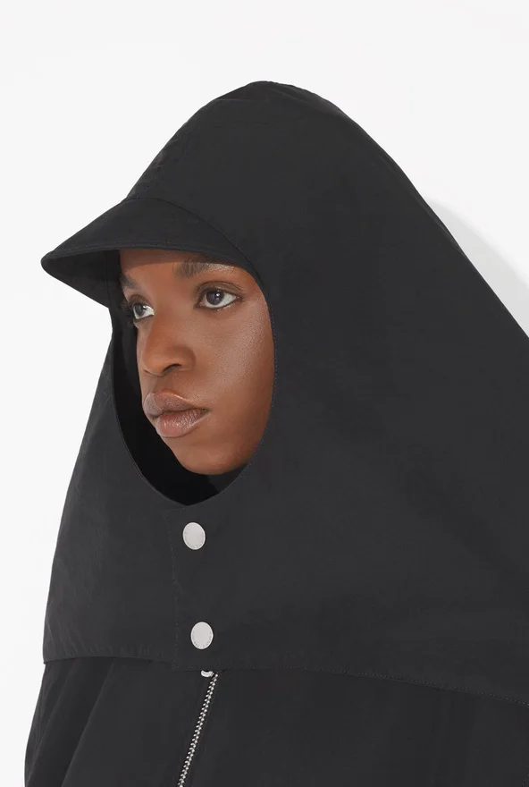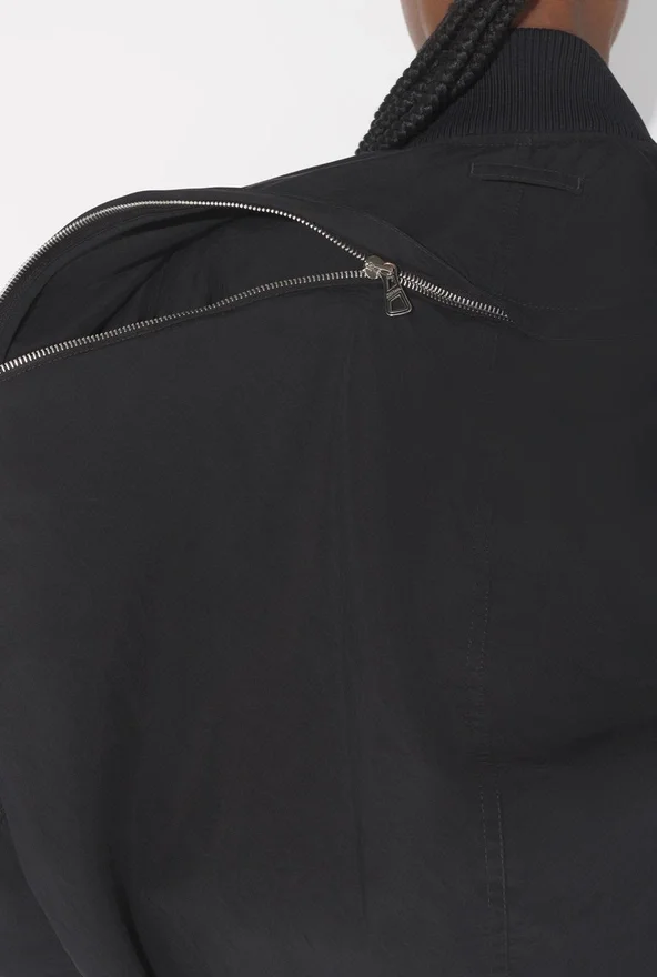 Black Nylon Bomber Jacket with Zipper Fastening in Back and Built-In Hood.
