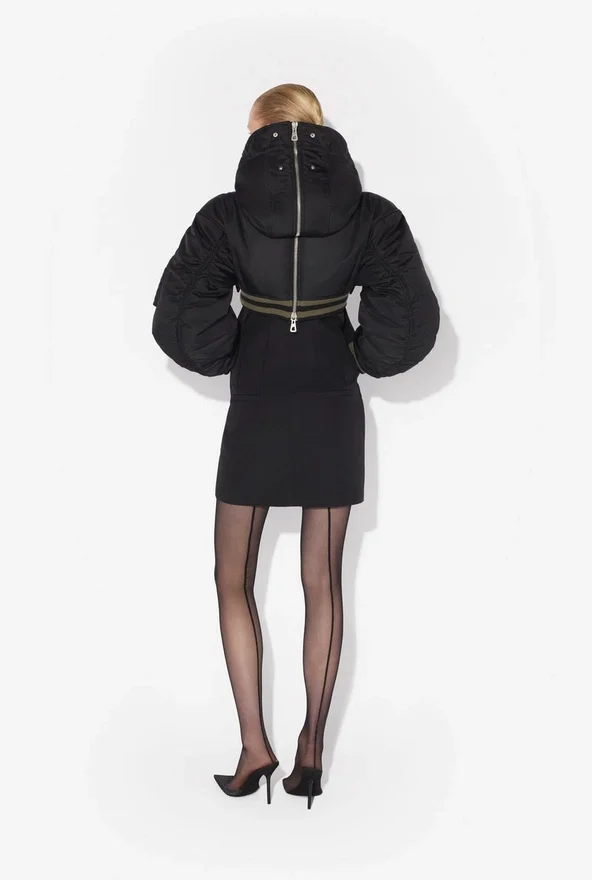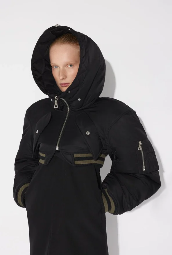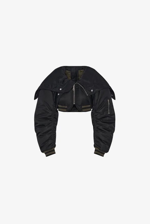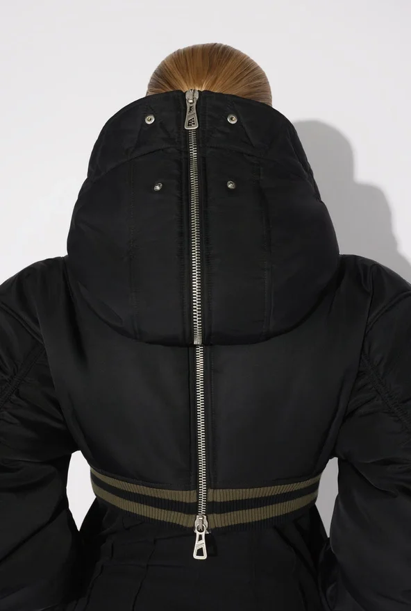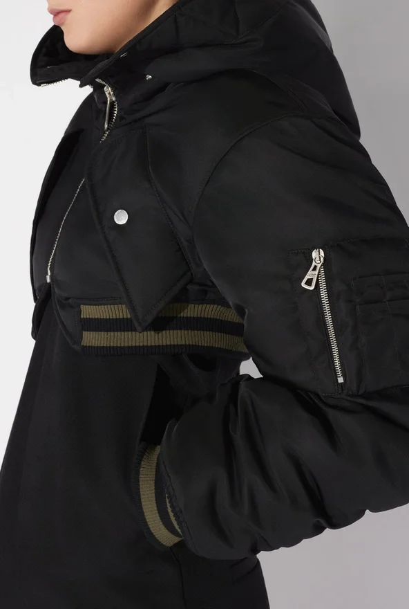 Black Cropped Bomber Jacket in Quilted Nylon with Ribbed Edges in Striped Knit and Oversized Hood.