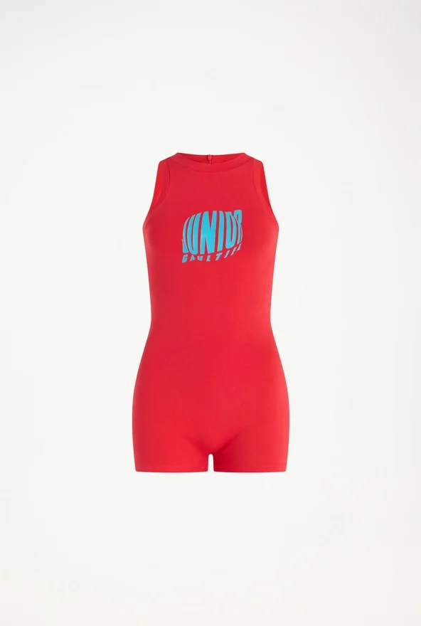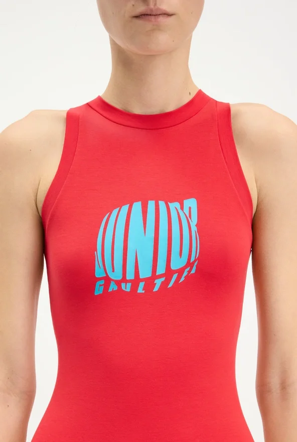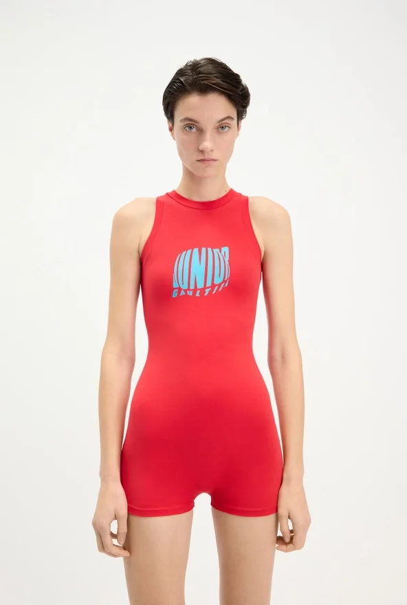 Red Jersey Tank-Top Playsuit with “Junior Gaultier” Printed Logo Detail on Chest.