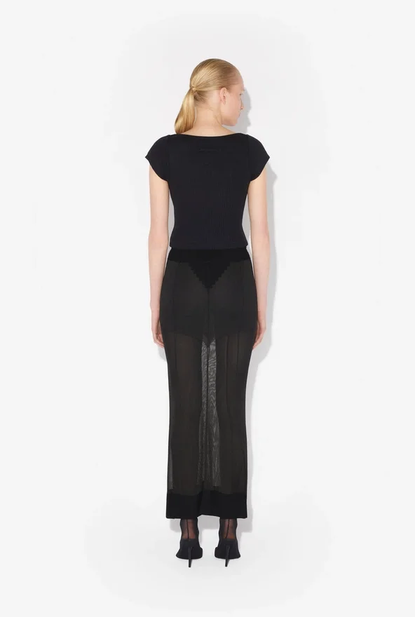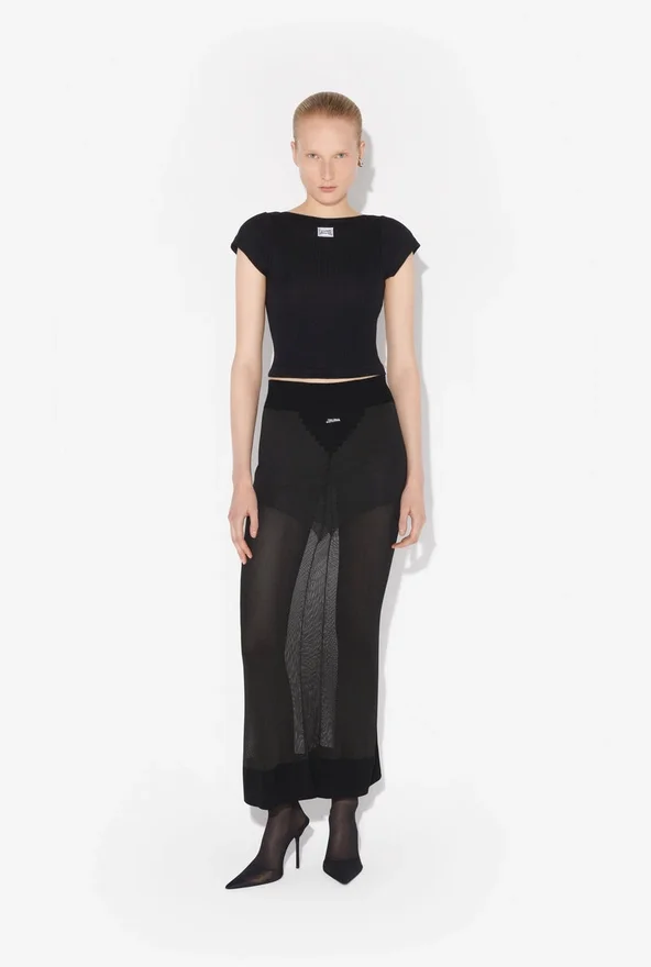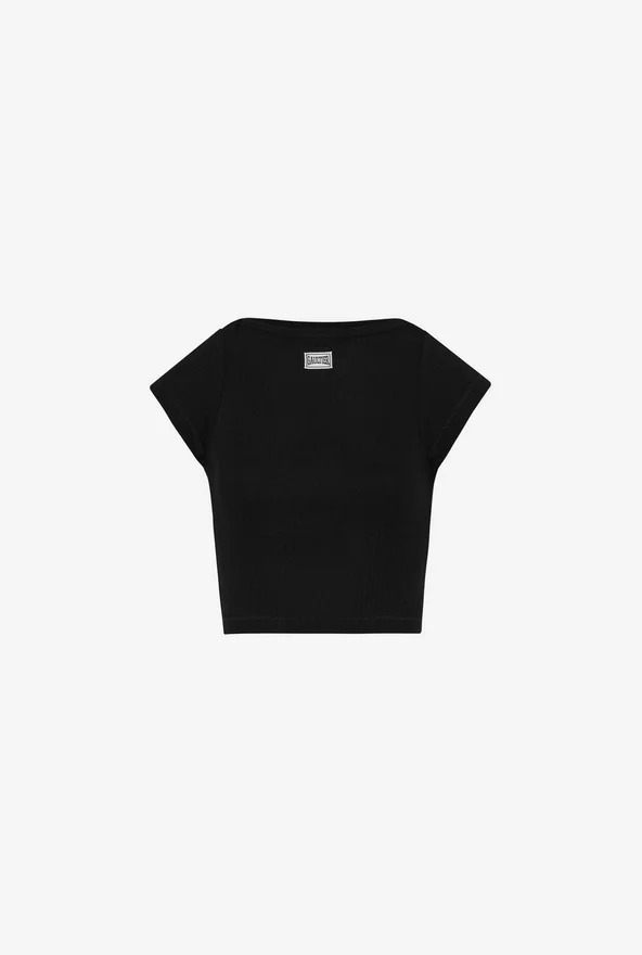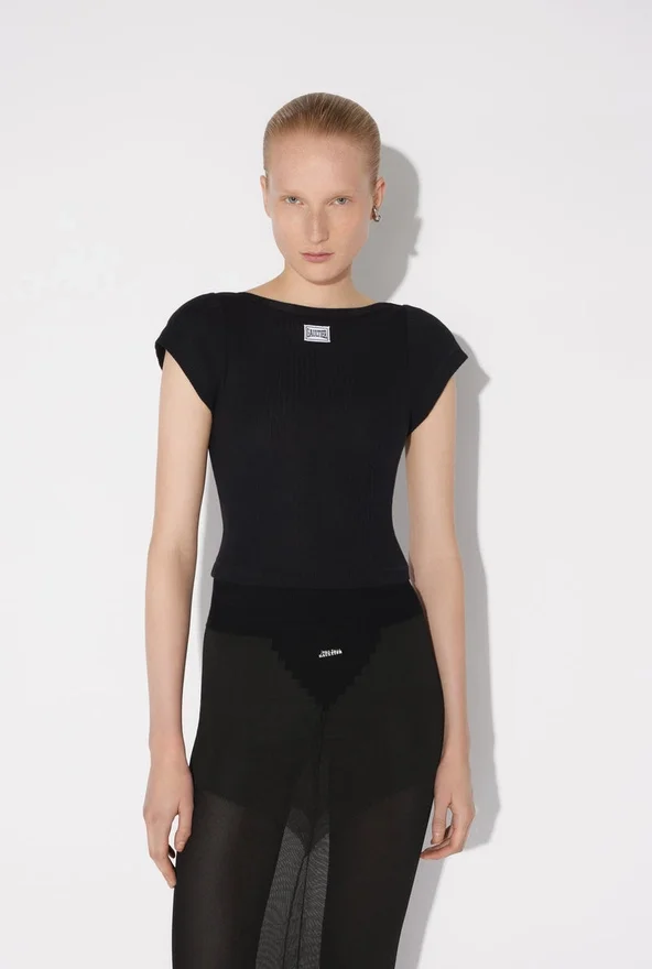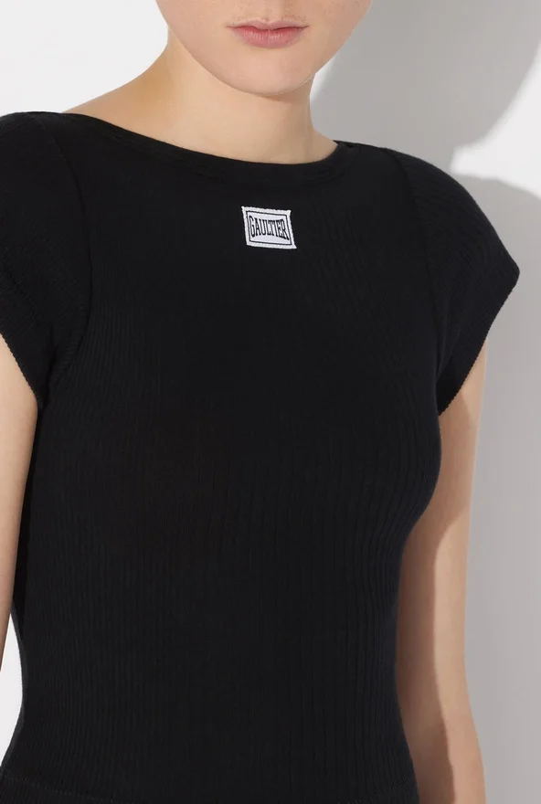 Cropped Black Cotton T-Shirt with Gaultier Patch Below the Neckline.