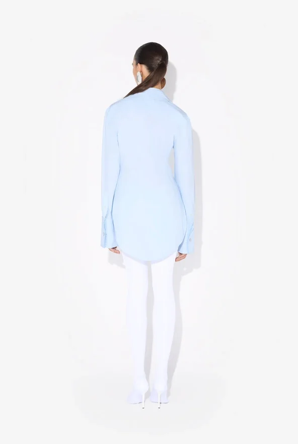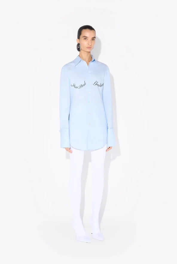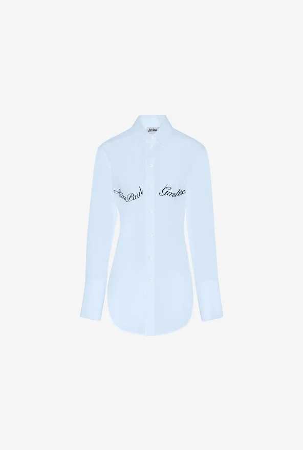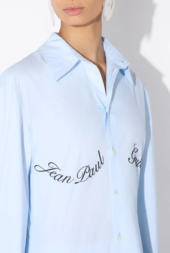 Blue Cotton Poplin Shirt with Jean Paul Gaultier Logo Print Outlining the Bust.