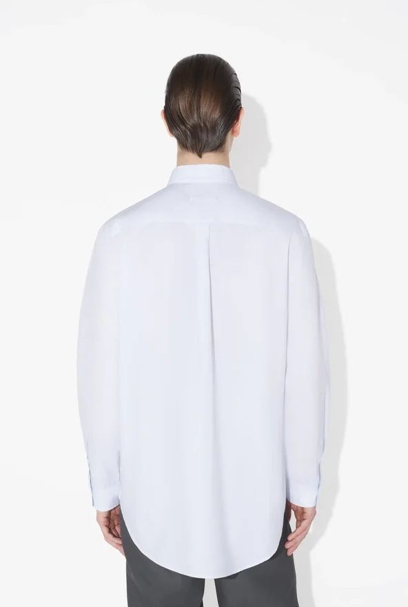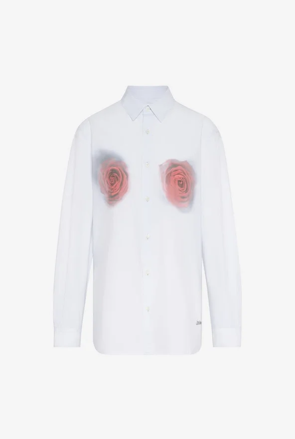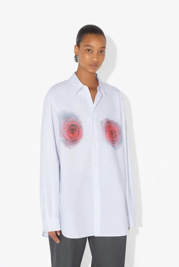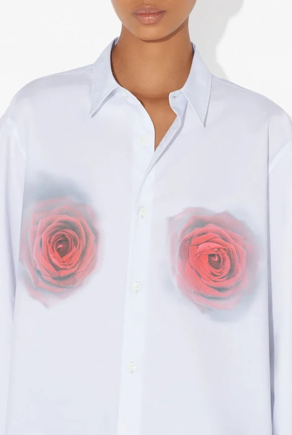 White Cotton Shirt with Red “Blurry Roses” Print.