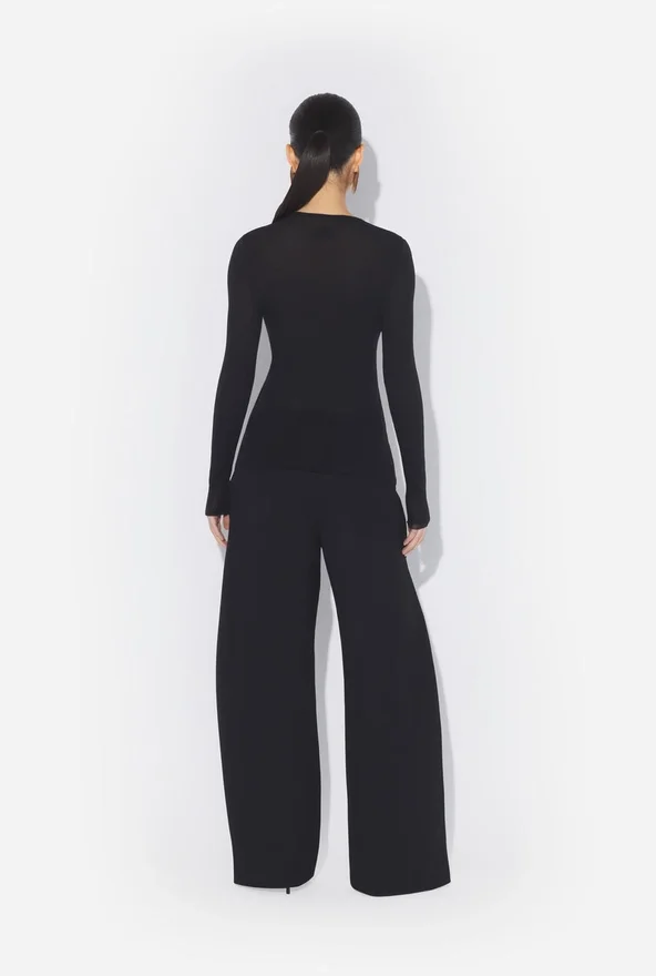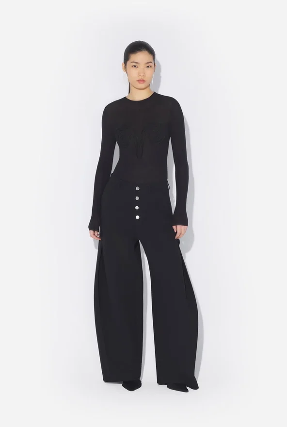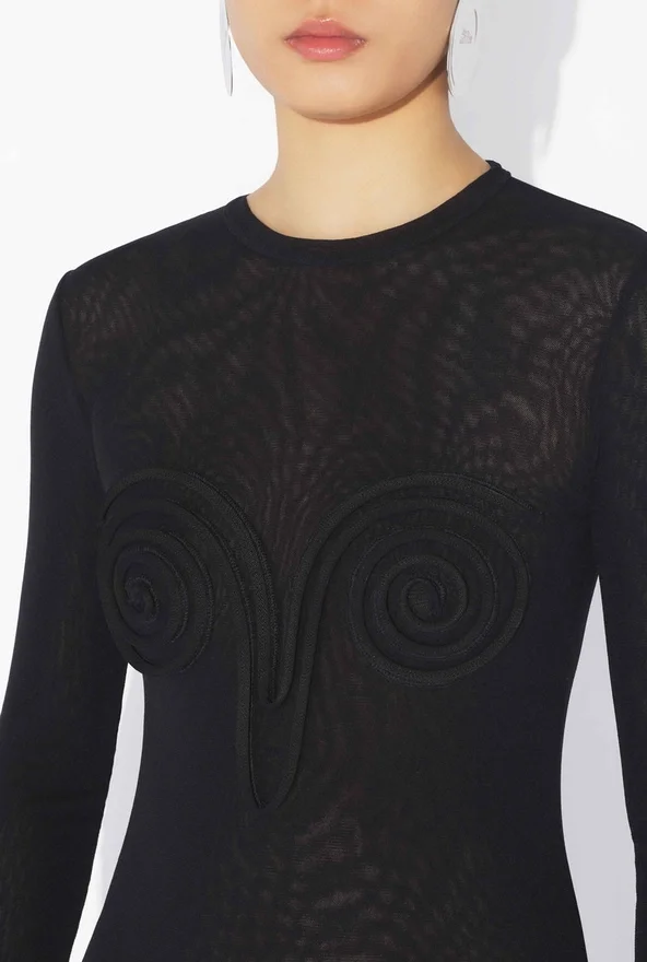 Long-Sleeved Black Tulle Top with Tonal 3D “Spiral” Detail.