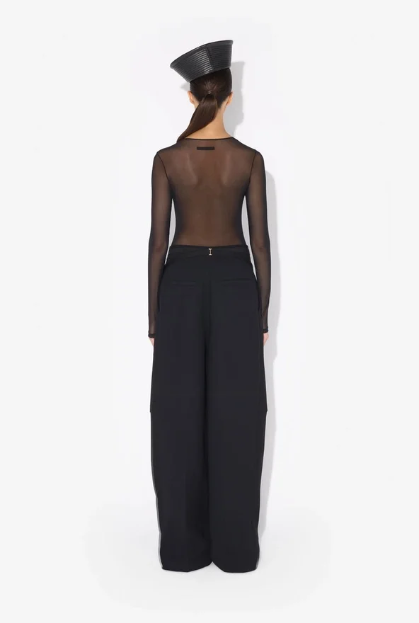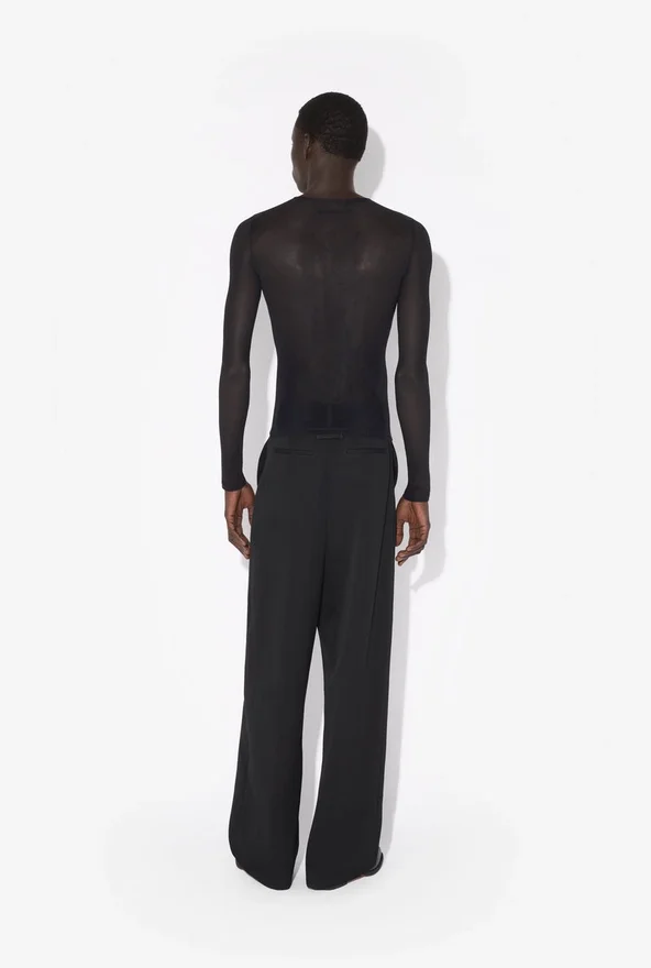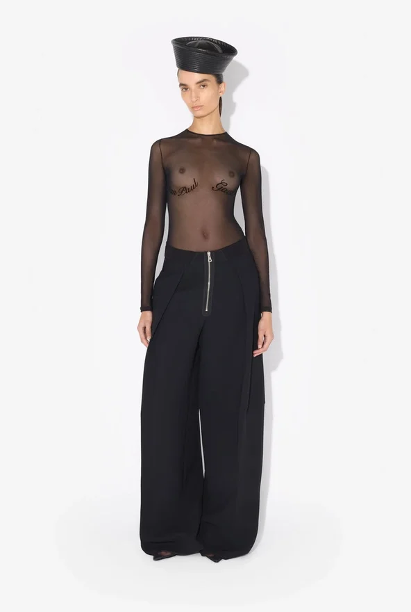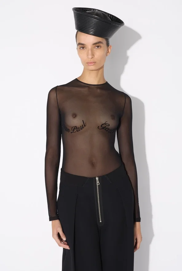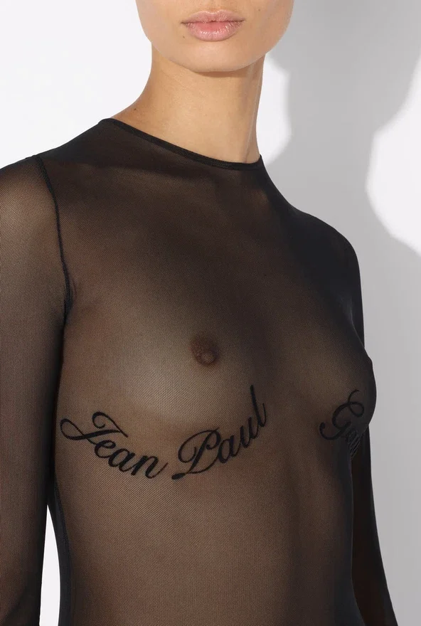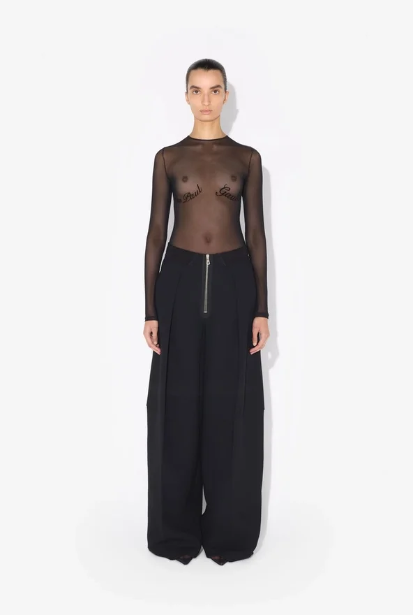 Long-Sleeved Draped Black Tulle Top with Flocked Velvet Jean Paul Gaultier Logo Detail.