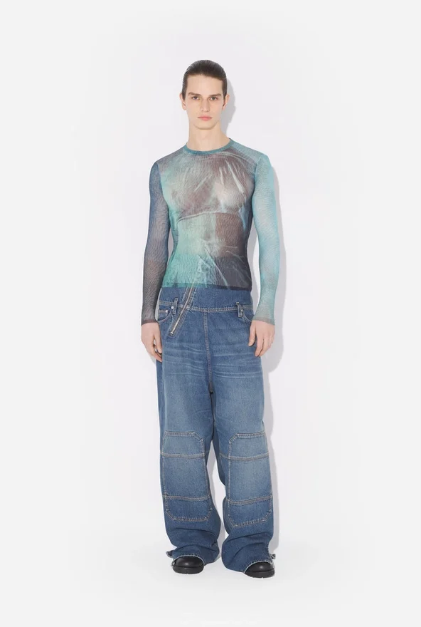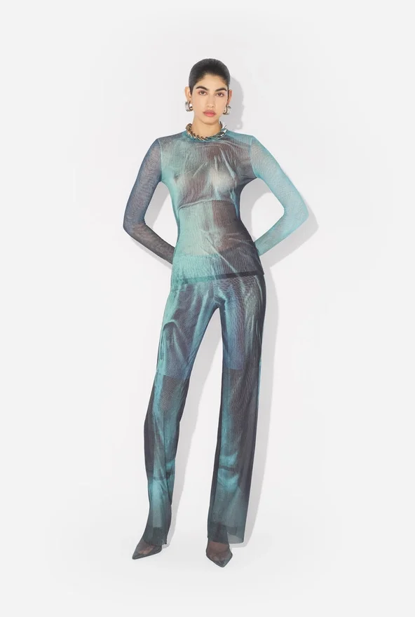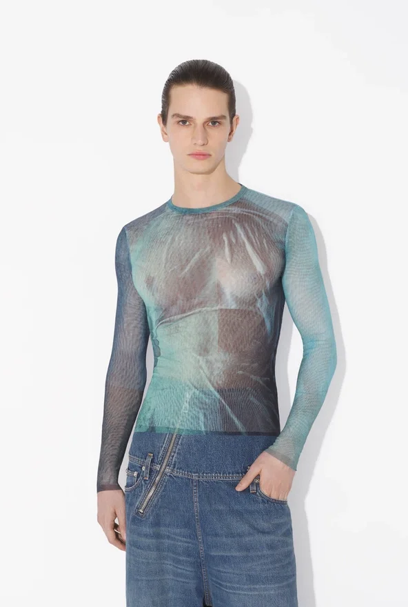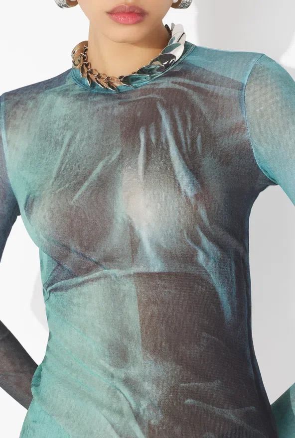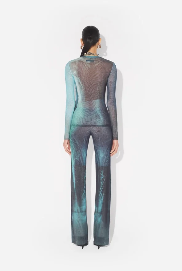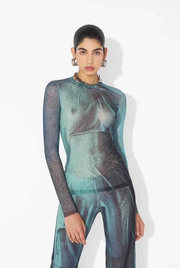 Long-Sleeved Blue Tulle Top with “Water” Print.
