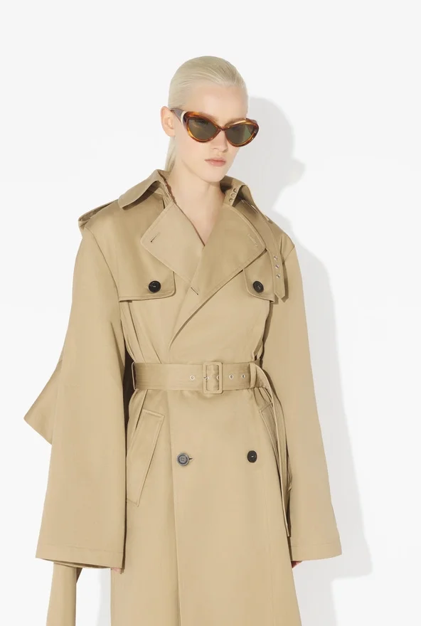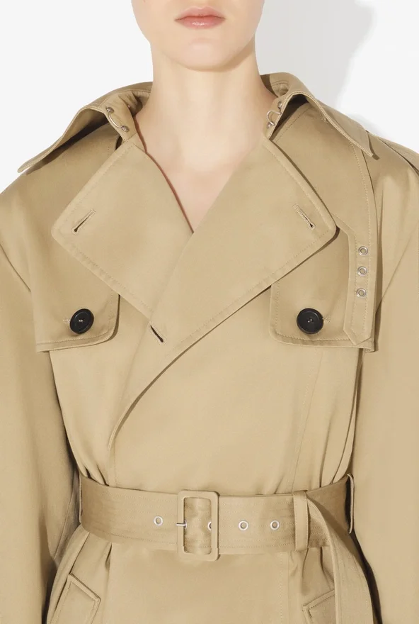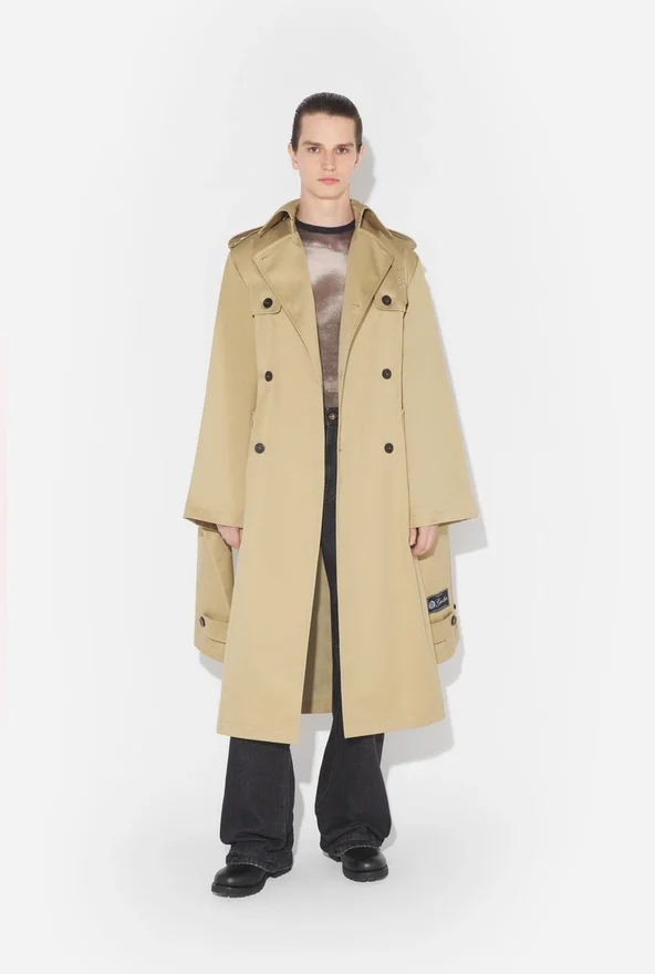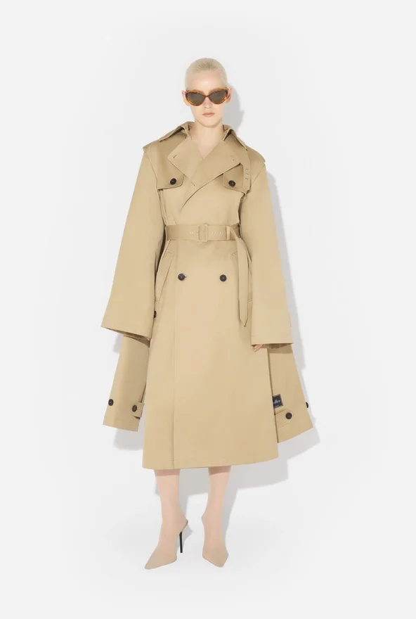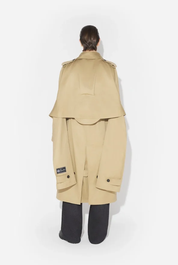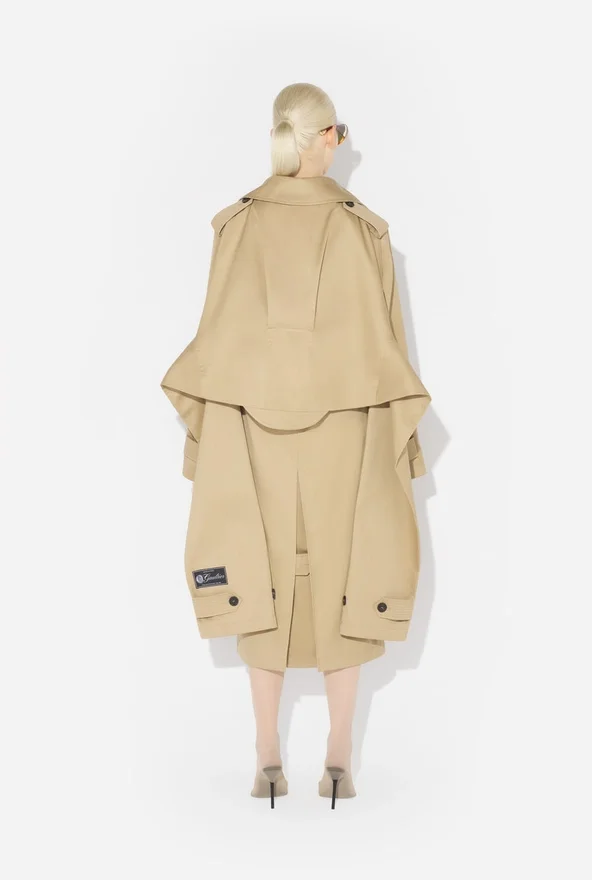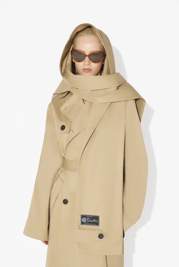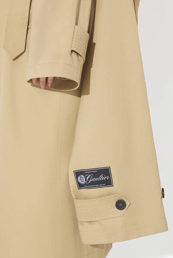 Beige Cotton Twill Trench Coat with Built-In Hood and Scarf, and Jean Paul Gaultier Label Detail.