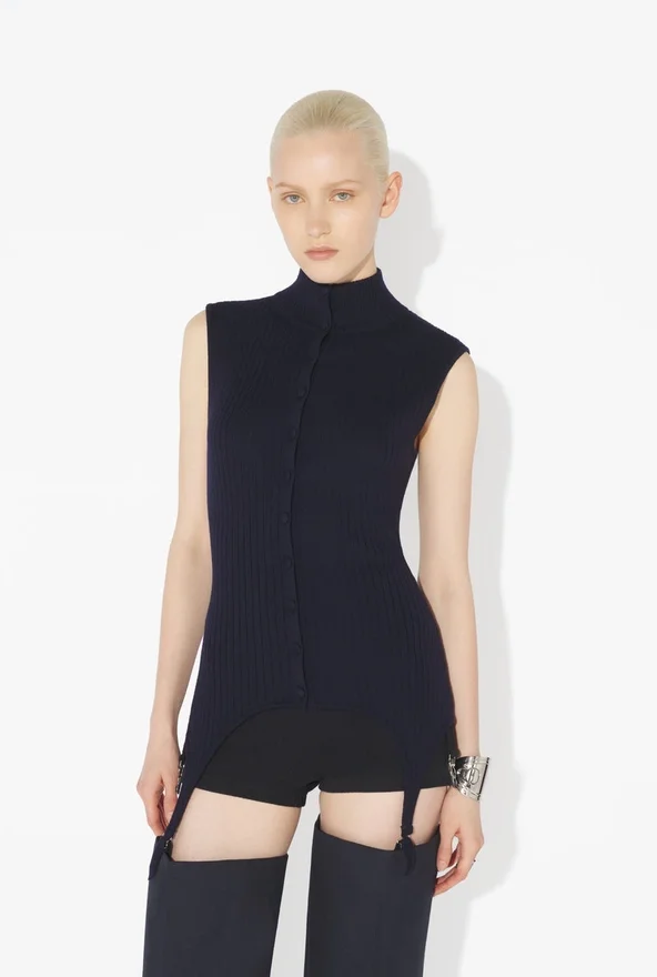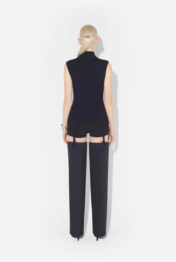 Navy Ribbed Merino Wool Waistcoat with Garter Details.